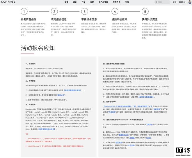 IT之家注意到,華為鴻蒙 HarmonyOS 6 開發者版本體驗招募(二期)目前報名時間已延期至 9 月 29 日 10:00(此前報名時間為:2025 年 9 月 15 日-2025 年 9 月 22 日 10:00),這意味著用戶可在此期間繼續報名升級。