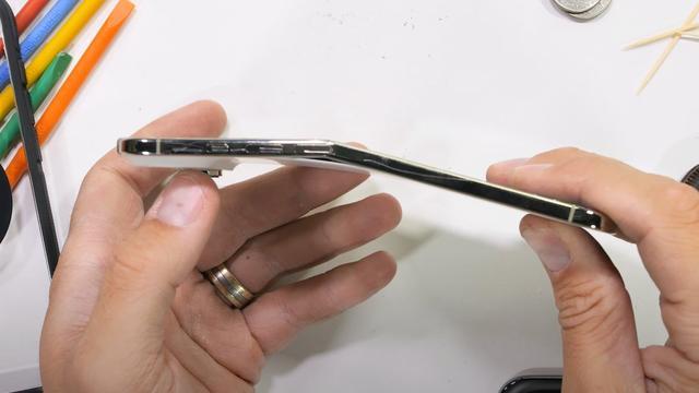 核心“彎折測試”環(huán)節(jié),憑手動(dòng)用力彎曲,機(jī)身雖出現(xiàn)輕微形變但均可恢復(fù),未見嚴(yán)重?fù)p傷。隨后,主持人以機(jī)械裝置施加重壓,在216磅(約98公斤)作用下,屏幕出現(xiàn)碎裂,鈦金屬中框出現(xiàn)明顯折痕,背部玻璃依然完好,屏幕仍可正常工作。