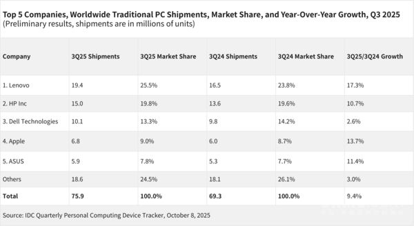 CNMO獲悉,2025年第三季度全球傳統PC(包括臺式機、筆記本電腦和工作站)市場中,前五家企業表現亮眼。總出貨量達到7590萬臺,同比增長9.4%。其中,聯想以1940萬臺的出貨量、25.5%的市場份額,位居第一。其同比增長了17.3%,也遠超其他廠商。