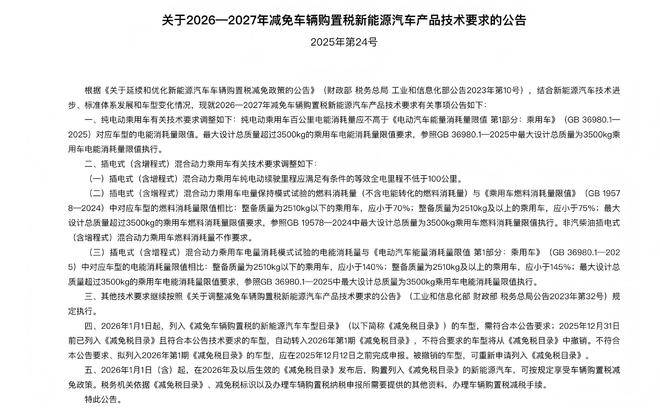 10月13日電 (龔宸芫)《關于2026—2027年減免車輛購置稅新能源汽車產品技術要求的公告》(下稱公告)近日發布,對純電動乘用車和插電式(含增程式)混合動力乘用車有關技術要求進行了調整。公告將于2026年1月1日起正式實施。