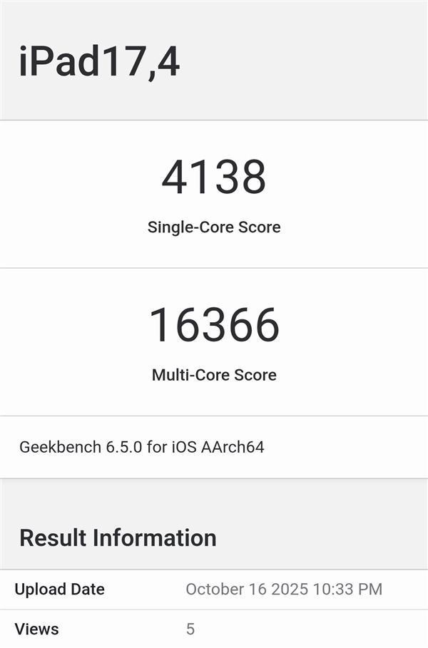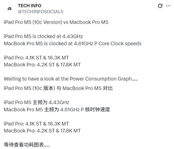 MacBook Pro版本M5的多核跑分達(dá)到了17862分,比iPad Pro版本高出約9%,主要得益于MacBook Pro更強(qiáng)大的主動散熱系統(tǒng),能讓芯片以更高的頻率(4.61 GHz對比4.43 GHz)和更持久的性能運行。