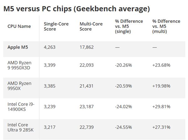 不過在多核性能方面,基礎(chǔ)款M5由于核心數(shù)(10核)不足,成績被核心數(shù)更多的AMD和Intel旗艦產(chǎn)品拉開差距。