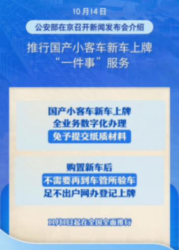 公安部10月14日在京召開新聞發布會介紹,11月1日起在全國全面推行國產小客車新車上牌“一件事”服務,推動車輛銷售發票、購置稅、保險等信息共享核查,實現國產小客車新車上牌全業務數字化辦理,群眾免予提交紙質材料。