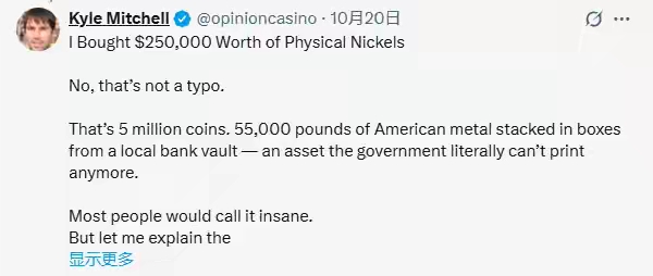 這場“瘋狂”背后是精密計(jì)算:美國5美分硬幣含75%銅與25%鎳,單枚金屬價(jià)值約6美分,已超5美分面值。米切爾的硬幣金屬總價(jià)值達(dá)29萬美元,且今年銅價(jià)已漲23%,天然具備增值空間 。更關(guān)鍵的是其“零風(fēng)險(xiǎn)”邏輯:即便金屬價(jià)下跌,硬幣仍保有25萬美元面值,堪稱不對稱賭注。