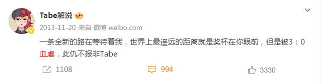 2013年,Tabe作為選手輸給SKT(T1前身)立下報仇誓言。Tabe微博截圖