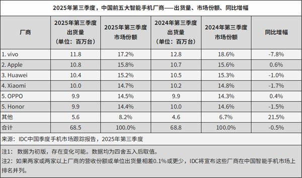 11月7日消息,根據(jù)IDC最新手機季度跟蹤報告顯示,2025年第三季度,中國智能手機出貨量約6846萬臺,同比下降0.5%,延續(xù)下降趨勢。