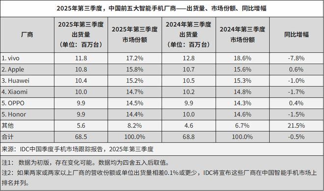 因iPhone 17系列熱銷,蘋果守住了市場份額。IDC披露的2025年第三季度中國手機市場報告顯示,蘋果出貨量為1080萬臺,同比微增0.6%,超越華為。