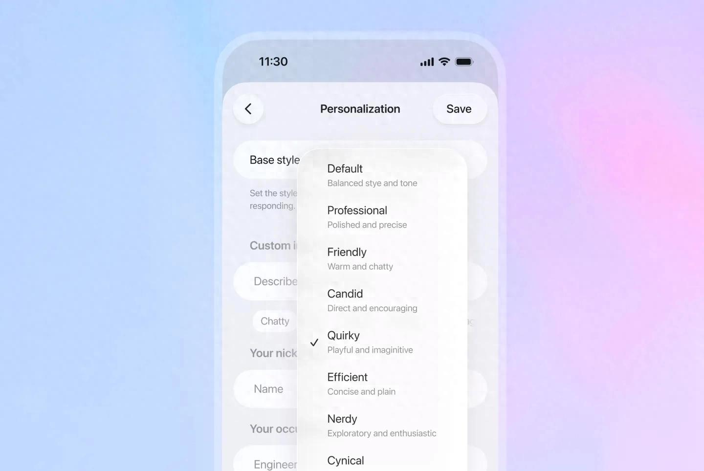 此次更新的另一大亮點,是OpenAI極大豐富了對話風格“個性預設”選項,用戶如今可在“默認、專業、友好、坦率、古怪、高效、書呆子和憤世嫉俗”等多種個性之間靈活切換。OpenAI還宣布將試驗允許部分用戶直接在設置中微調ChatGPT的語言風格。