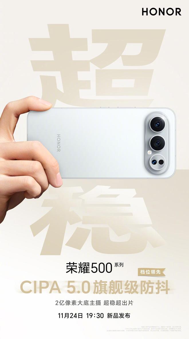 據了解,榮耀將于11月24日19:30舉辦主題為“2億人像Live實況之夜”的新品發布會,推出榮耀500系列,由肖戰擔任該系列代言人。該系列含超級標準版與超級Pro版,全系配8000mAh電池和2億像素主攝,搭6.55英寸1.5K直屏。性能上,標準版用驍龍8s Gen4,Pro版用驍龍8 Elite。Pro版影像與續航更出色,額外搭載長焦鏡頭,支持50W無線充電,還配有3D超聲波指紋等配置。影像方面,新機有前后置Live人像美顏等諸多實用功能,目前該系列已開啟全渠道預約。