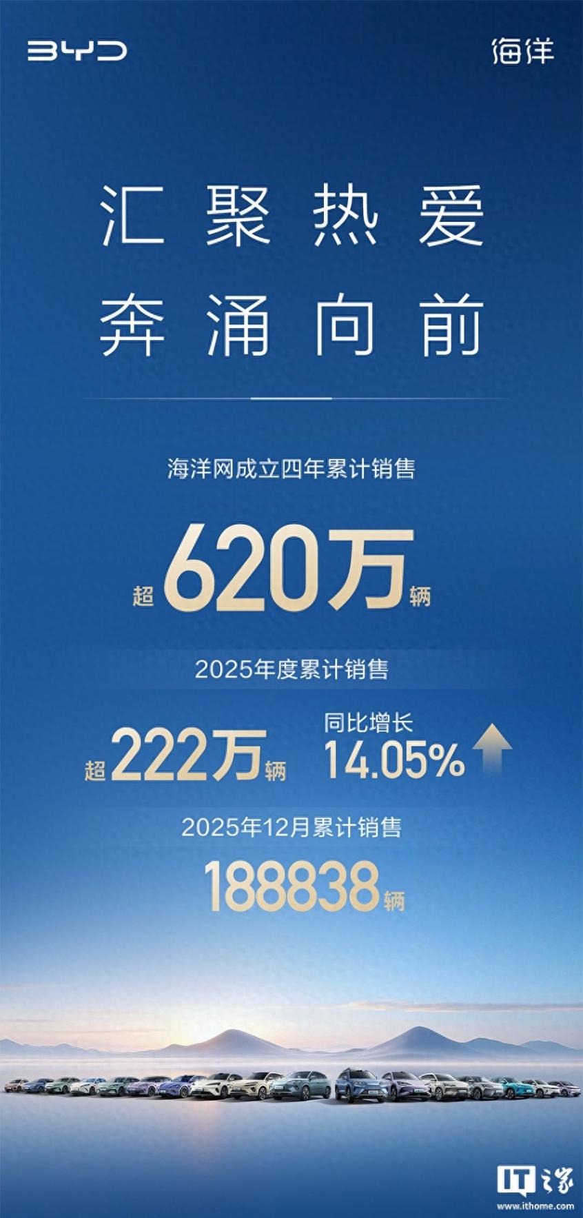 1 月 5 日消息,比亞迪汽車官方昨日宣布,比亞迪海洋網成立四年累銷超 620 萬輛;2025 年度累銷超 222 萬輛,同比增長 14.05% ;12 月銷售 188838 輛。