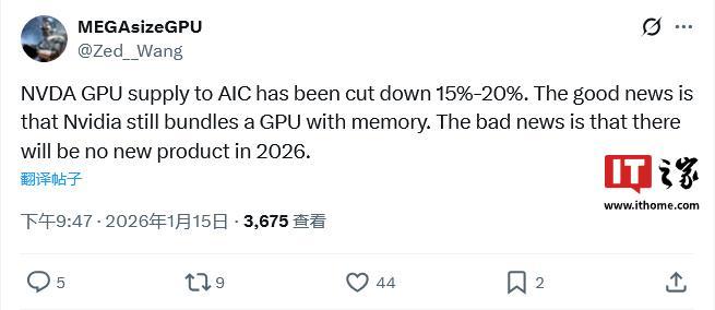 IT之家注意到,消息人士 MEGAsizeGPU (@Zed__Wang) 表示,英偉達對下游 GeForce 顯卡 AIC 的供應規模已經削減了 15~20%;好消息是英偉達仍打包出貨顯存,壞消息則是今年將見不到新的 GeForce 顯卡型號。