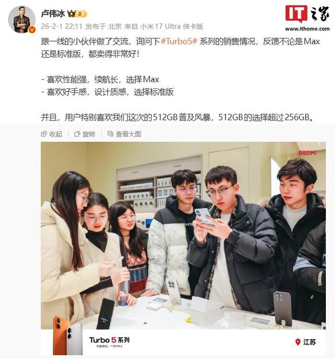 2 月 2 日消息,小米集團合伙人、總裁,手機部總裁,小米品牌總經理盧偉冰昨晚發文透露了 REDMI Turbo 5 系列的銷售情況,稱一線反饋不論是 Max 還是標準版,都賣得非常好。