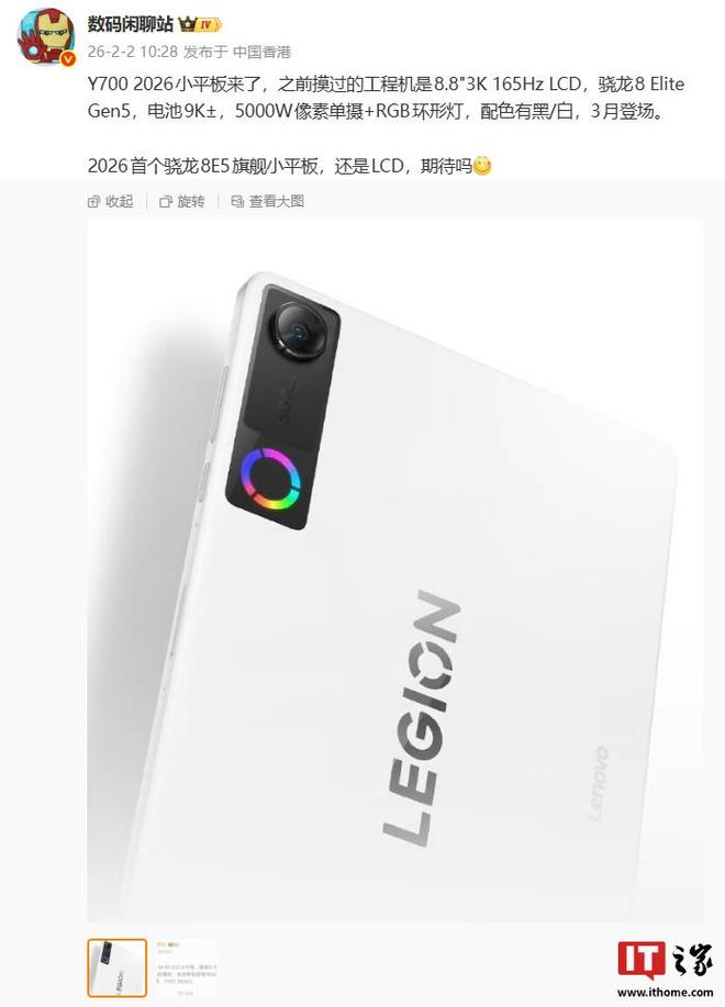 IT之家注意到,博主 @數碼閑聊站 今日發文透露,聯想拯救者 Y700 2026 小平板是 2026 首個驍龍 8E5 旗艦小平板,工程機配備 8.8 英寸 3K 165Hz LCD 屏,搭載驍龍 8 Elite Gen5 處理器,電池容量來到了 9000mAh 級別,后置 5000W 像素單攝 +RGB 環形燈,提供黑 / 白配色。