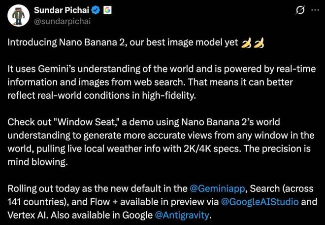 谷歌CEO皮查伊發帖聲稱:「這是我們迄今為止最好的圖像模型。」